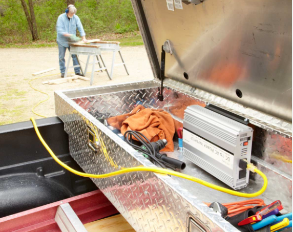 If you want to get a little more creative, it’s fairly simple to build an emergency battery bank into a truck tool box and permanently wire an inverter into your battery and mount it in your vehicle. If you want to get more elaborate, you could add batteries to you tool box and use the power from the vehicle to charge those batteries, then connect the inverter to that battery bank.