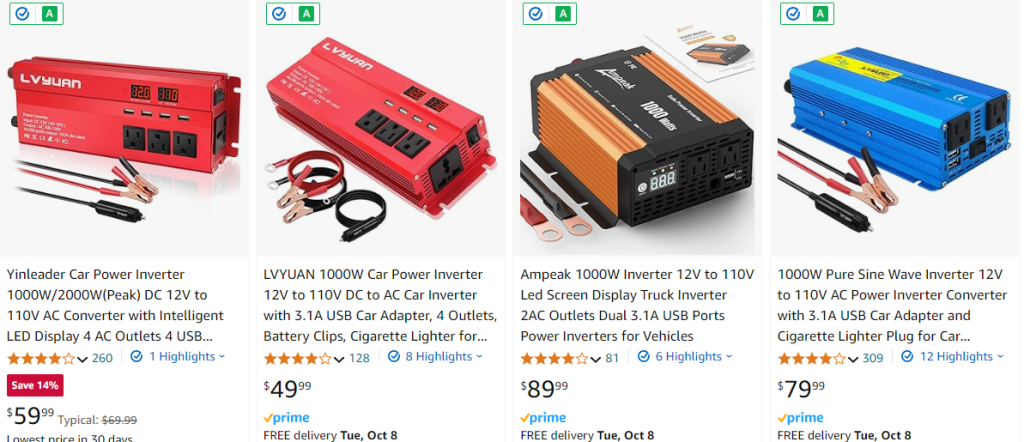 I don’t have any scientific testing to determine how efficient a clamp on connection is compared to a bolt-on, but I’m guessing there’s a big difference. If you think you might need to run your inverter a lot and power major appliances for a few days, you may want to get a heavy cable and bolt them onto the battery terminals if possible.