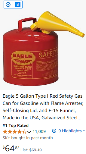 The other big hassle is fuel storage, especially in a hot humid climate. The most reliable routine is to buy one quality can per month for 12 months and put that month’s number on it. 12 x 5 gallon cans provides 60 gallons of fuel. Each month, pour that month’s can into your car and go refill it.
