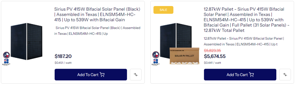 They sell panels by the pallet for a little savings, so it’s good if you can plunk down $5,000 for 30-32 400+ watt panels all at once. That will also make your life a little simpler later when building out your system.