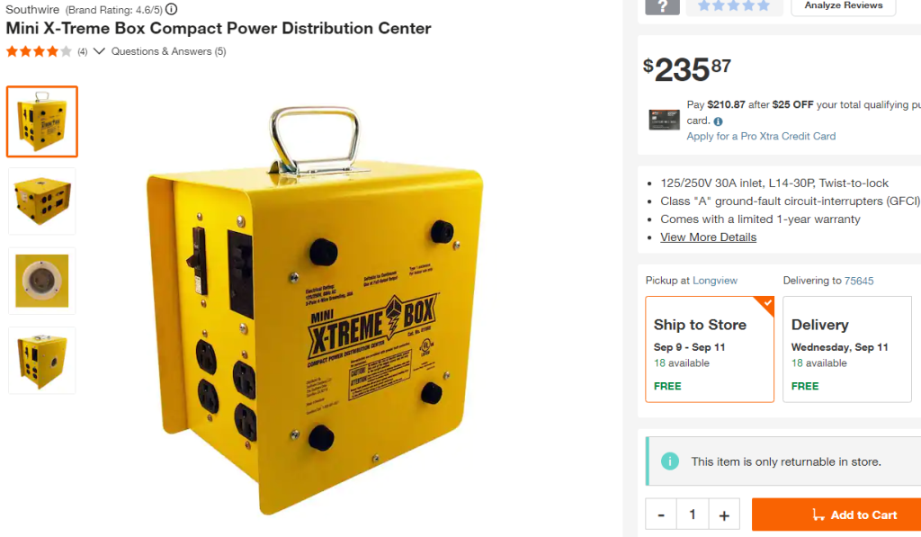 Then I’d buy a quality job-site power distribution box that has a bunch of outlets I can tap into to run multiple things. Maybe something like this, so I can run the fridge, a room AC unit, charge every device and battery, etc.