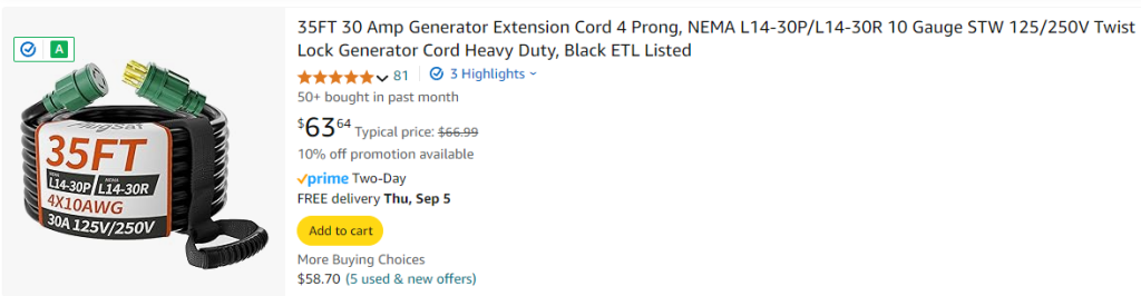 Then I would buy a good 30-AMP RV cord that’s long enough to reach into my kitchen so I have 1 heavy duty power cord running into the house.