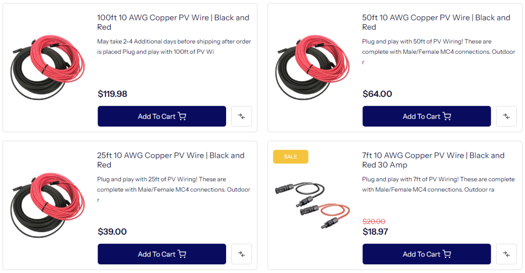 You’ll need a way to get power from your panels to your inverter. Signature Solar is a good source for that too. The 6000XP inverters have two inputs with a maximum of 4,000w each. We have 9 x 415W panels listed above because putting 10 on would technically put us over the limit. The odds of 10 panels generating more than 4,000w is slim, but it’s possible. Also, these panels are “bi-facial” meaning if you have them above a reflective surface, they can pick up some juice on the back side too.